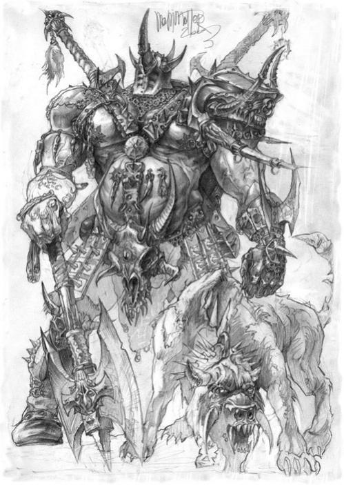 Кхорн - Кровавый бог, один из четырех богов Хаоса. Он - бог злобы и разрушения, воинственный бог Хаоса, чей гнев простирается вне места и времени. Его медный трон стоит на горе черепов его последователей, павших в сражении, и тех, кто был убит ими. Всякий раз, когда Чемпион Кхорна гибнет в бою, его череп занимает свое место в груде, которая постепенно растет, отражая успех его последователей; но сколь высокой бы она ни стала - никогда не насытится Кровавый бог смертью и насилием.