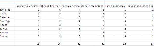 1 место - «Эффект Фреголи». 2 место – «Долина ста ветров». 3 место – «Вот такие глаза». 4 место – «По клатскому счету». 5 место – «Вино из черноплодки». 6 место - «Звезды и полосы». Вложение 9640 |
