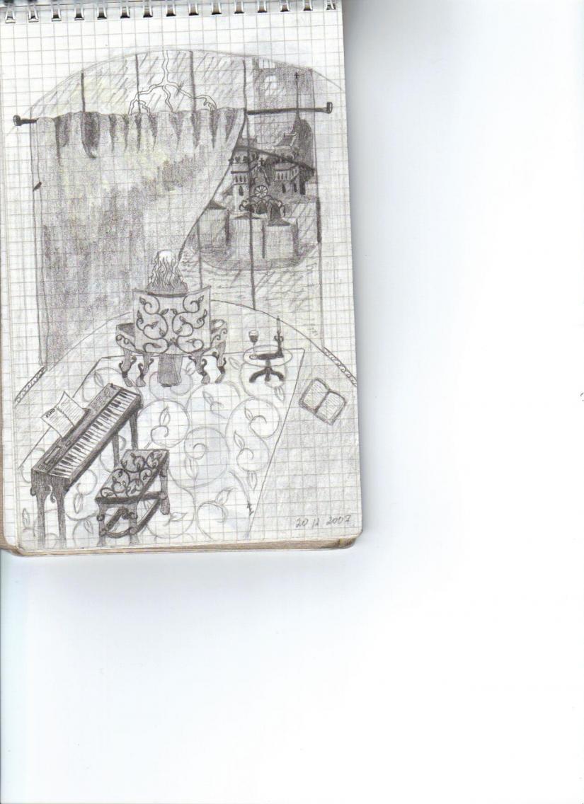 Есть еще вот это. Остальное надо сканировать. Вот кое-что еще... С лицами я не дружу) просто когда я это рисовала нужные выражения лица не приходили. И я почти всегда рисую статику. В Searching inspiration - на заднем плане - собор, может его не очень хорошо видно, но я старалась ![]() Не судите строго...по крайней мере, слишком... Нарисовала на уроке... Теперь не могу понять: он ей угрожает или защищает ее? И еще не могу понять в чем заключаются косяки...то есть знаю, но как их исправить? ![]() Первая картинка - пока что единственная, на которой больше, чем двое, эээ, существ) Вторая - Найтвишу любимому посвящается. Вот, как-то решила порисовать с натуры и что из этого вышло.