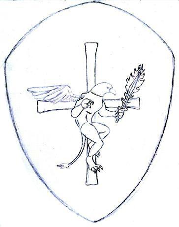 Идея герба: щит с красным крестом, на нем (поверх креста)- грифон с короной на голове, стоящий на задних лапах, держащий в лапах огненный меч.