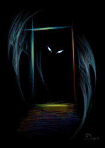 Два горящих глаза, очевидно принадлежащих зловещему существу семейства кошачих... Хищно смотрящие из-за каменного шара и не предвещающие ничего хорошего.... :) И ещё у этого существа есть таинственные кожистые крылья!
