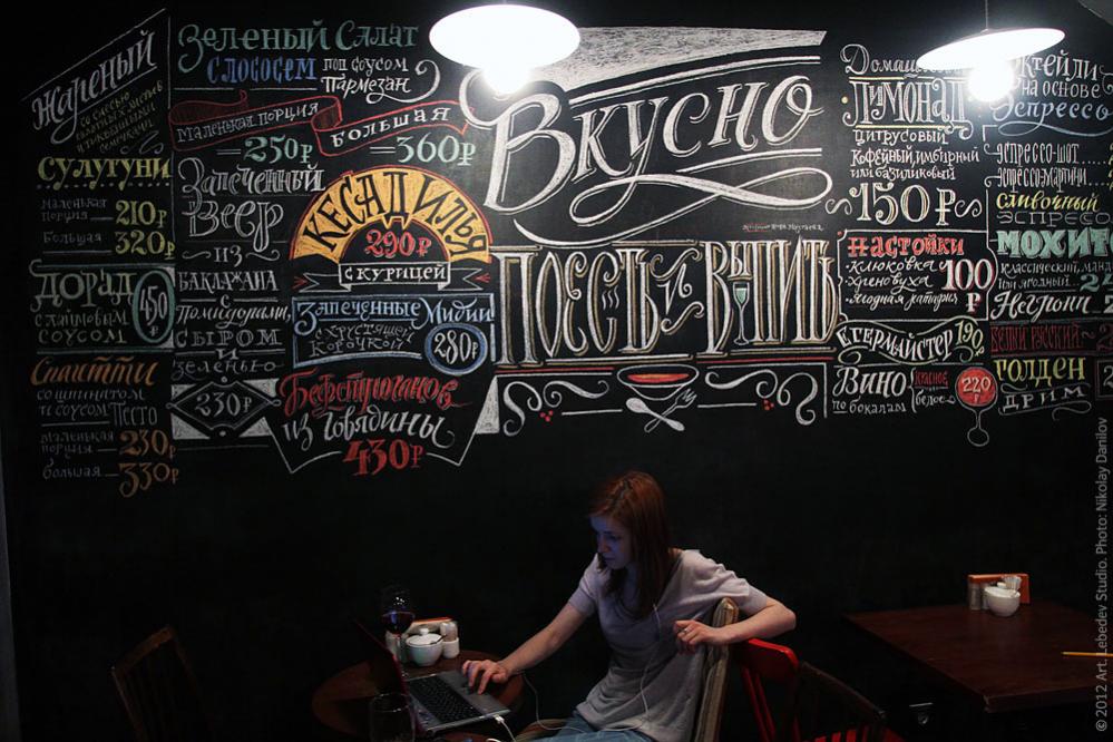 В Большом Кафе студии Лебедева одну из стен оформили дружелюбными глазу шрифтами.