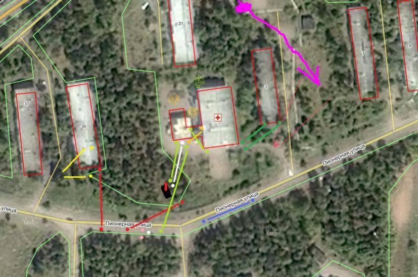 Оранжевое и два зеленых пятна - Лайтман, Альфа 8 и Альфа 1. Пока спрятались за больницей, и начнут движение по белой траектории, как только откроется стрельба, чтобы зайти пришельцам в тыл и закидать их гранатами.