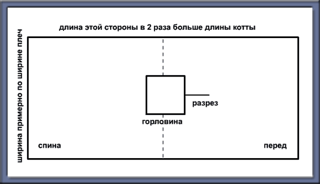 Начнем: КОТА: Вам понадобится кусок ткани в два раза больше, чем длина будущего изделия, а по ширине примерно как ваши плечи. Нужно согнуть этот материал пополам в длину и вырезать отверстие для головы. Учтите, что спереди вырез должен быть глубже, чем сзади. Форма горловины может быть любая - прямоугольная, круглая, V-образная. Если голова не пролазит, сделайте дыру побольше или спереди сделайте небольшой разрезик, который потом оформить какой-нибудь застёжкой. Как ни странно, котта готова. Осталось только обработать все срезы косой бейкой. На груди и спине можно вышить (нарисовать, сделать аппликацию) герб. Если ткань тонкая, лучше шить в два слоя.