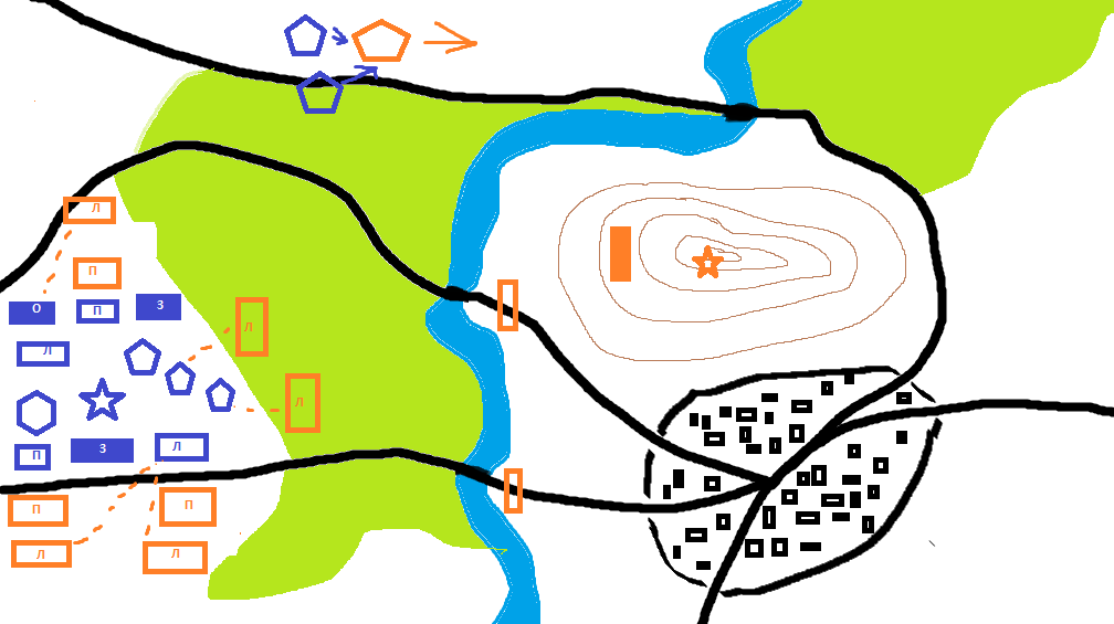 Наша кавалерия, была отбита противником. Однако, они сумели уничтожить отряда пехоты и отряд лучников. Вторая группа кавалерии, оттеснила вражескую. Кавалерия противника, отступает вдоль северной дороги к мосту. Враги, подошли на дистанцию обстрела, и медленно продвигаются, ведя огонь. Также, с опушки леса, враги открыли огонь.