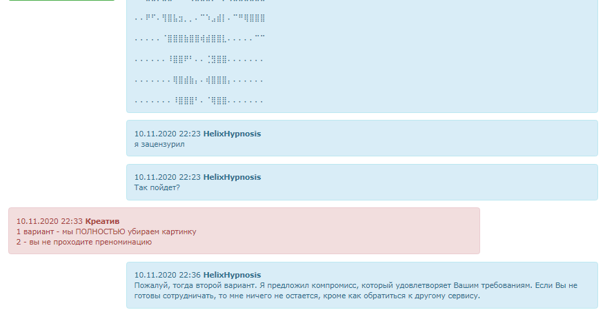 Ar Hel, насколько я поняла из скринов, вы затеяли рассказ ради того, чтобы представить миру свое художество (кстати, что там?) Конкурс, прежде всего, литературный. Если преноминатор посчитал, что картинка нарушает правила, значит, у него есть на то основания.