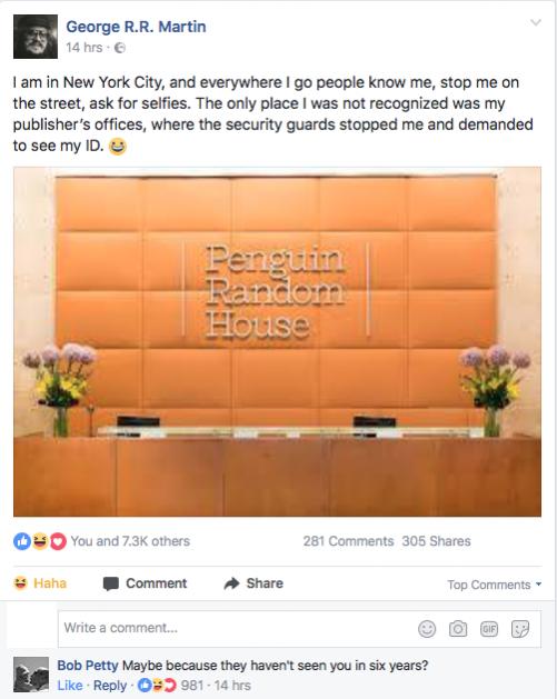 Немножко оффтоп. Джордж Мартин: Я в Нью-Йорке, и меня узнают везде, куда бы я ни пошёл, останавливают, просят сделать селфи. Меня не узнали только в офисе моего издателя, где охранник потребовал предъявить паспорт. Автора комментария: Может быть потому, что они не видели вас вот уже шесть лет?