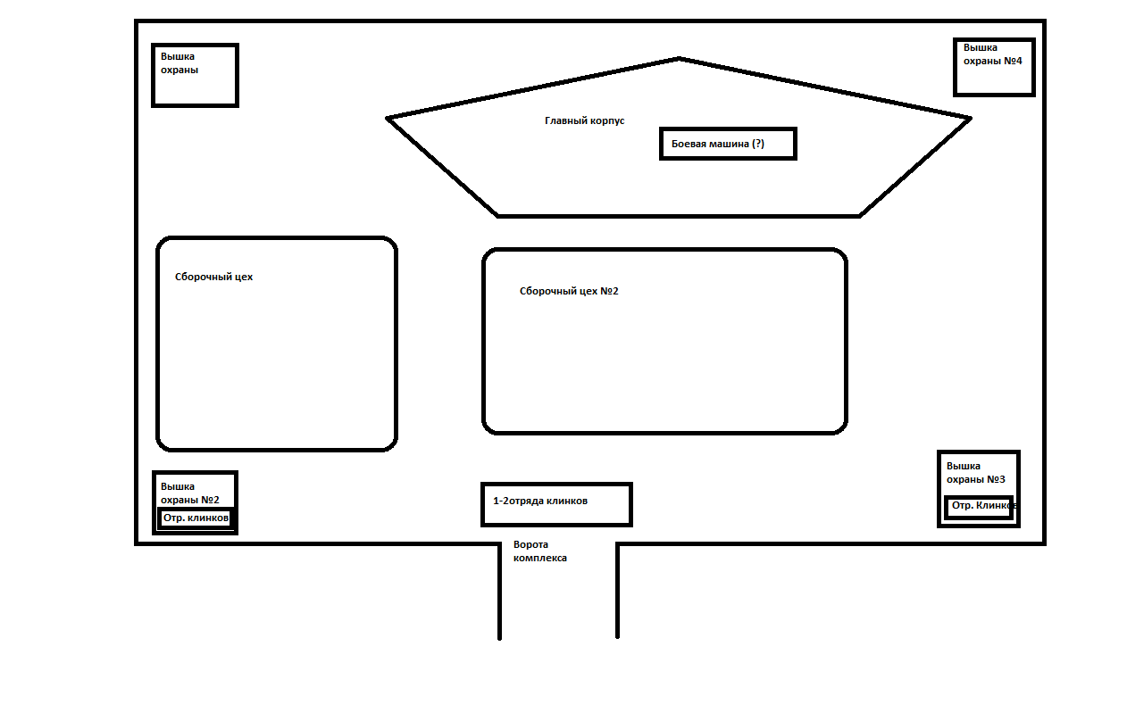 Два отряда противника, отошли от ворот к сборочному цеху. Клинки с вышек охраны, подавляют огнем мушкетеров.